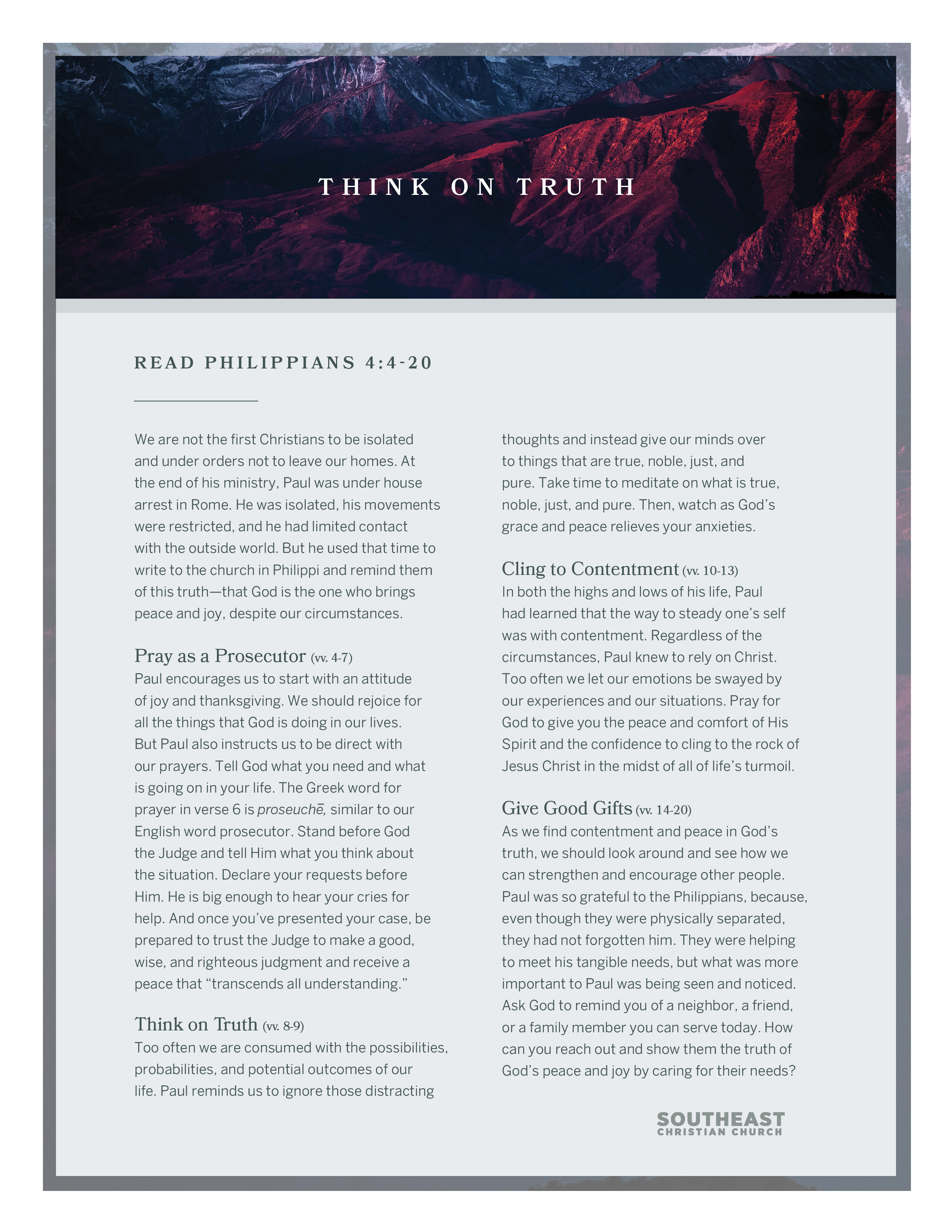 As we find contentment and peace in God’s truth, we should look around and see how we can strengthen and encourage other people. Paul was so grateful to the Philippians, because, even though they were physically separated, they had not forgotten him. They were helping to meet his tangible needs, but what was more important to Paul was being seen and noticed. Ask God to remind you of a neighbor, a friend, or a family member you can serve today. How can you reach out and show them the truth of God’s peace and joy by caring for their needs?